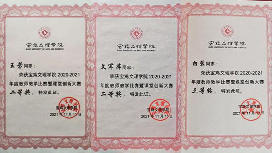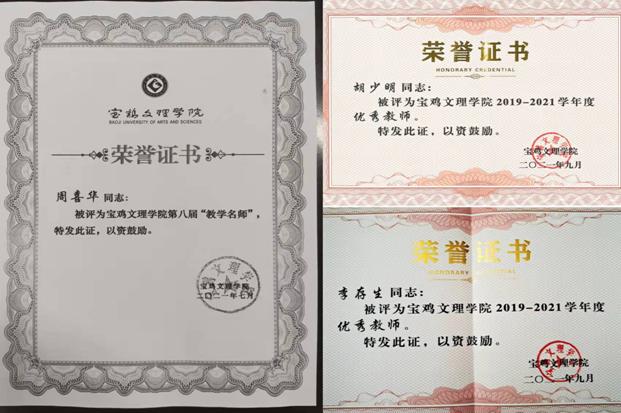 硕士研究生导师周喜华教授荣获学校第八届“教学名师”称号;硕士研究生导师胡少明副教授和李存生副教授荣获学校“优秀教师”称号;高轶俊副教授、韩怡讲师获学校2021年度“本科教学质量优秀奖”;硕士研究生导师文军萍副教授和王芳副教授获学校2020-2021年度教师教学比赛暨课堂创新大赛二等奖,白蓉博士获三等奖。