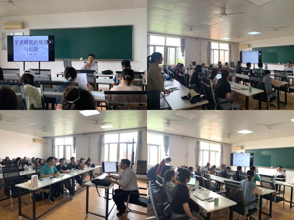 报告中,刘林魁教授从学术研究是研究生的使命出发,讲述了学术研究的思想立场,以“学术无禁区,讲台有纪律”和新华社发布的一批禁用词等为例,就学术论文基本信息、正文、参考文献等技术规范展开论述。刘林魁教授指出员工应该以高标准要求自身、坚持走出去,在前期阅读文献、查阅资料的基础上进行科技查新,通过“团队合作”“调查”“实验”等方式将任务拆分、目标调整、短期目标与长期目标结合,进行学术规划;同时以问题意识为引领,恪守学术道德规范,在“日新有功”的持续探索中不断提升自我的学术素养。在师生互动环节,刘林魁教授耐心地解答了师生提出的具体问题。
