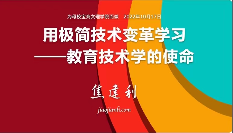 10月17日下午,华南师范大学博士生导师焦建利教授应邀在线举行学术报告,报告题目为《用极简技术变革学习—教育技术学的使命》。报告会由太阳成集团经理马多秀教授主持,太阳成集团教师、研究生和本科生共计150余人参加了报告会。