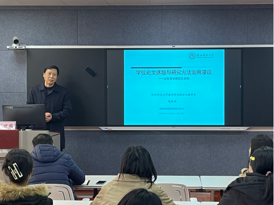 本次讲座紧紧围绕“研究生学位论文选题与研究方法”展开,从“研究生学位论文选题原则”、“研究生学位论文选题依据”、“研究生学位论文方法运用”和“研究生学位论文写作规范”四个方面进行逐一讲解,并就学位论文的选题、原则、路径、范例进行重点阐释。随后,陈教授结合多年教育理论研究和指导研究生的丰富经验,详细解读了思辨论证、调查研究、行动研究三种研究方法,对研究生学位论文写作规范提出建设性建议。