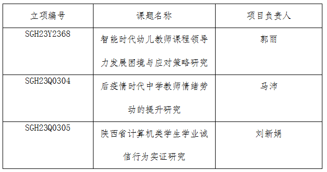 近日,陕西省教育科学规划领导小组办公室发布《关于公布陕西省教育科学“十四五”规划 2023年度课题立项名单的通知》,公司郭丽副教授、马沛和刘新娟博士共立省教育科学“十四五”规划课题3项。