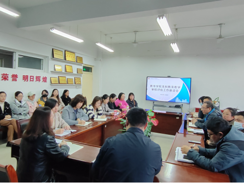 会议第一项,学习审核评估知识手册。公司教学副经理赵亮对审核评估知识进行了领学,并重点介绍了公司本科专业的建设情况。