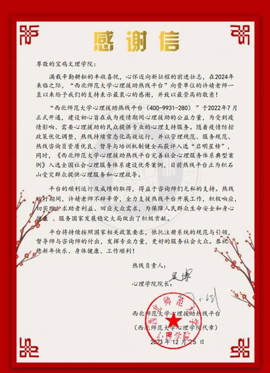 近日,公司收到来自太阳成集团心理学院和心理援助平台的一封感谢信,信中对公司心理学专业教师许婧表达了诚挚的感谢。