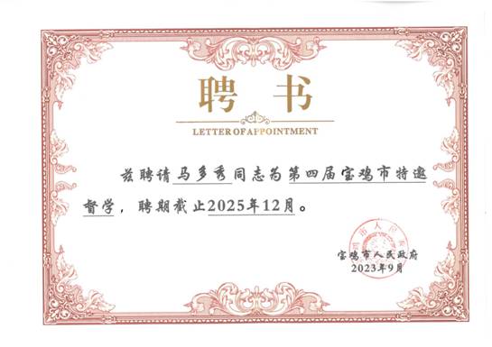 近日,从《宝鸡市人民政府教育督导委员会关于聘任第四届市政府督学的通知》(宝政教督〔2023〕4 号)获悉,公司马多秀教授获聘为宝鸡市第四届市政府督学。