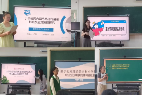 本次论坛由教育管理、学前教育、心理健康教育、小学教育的五位研究生进行汇报。2023级教育管理研究生韩丹丹以《改革开放以来中小学教师职前培养政策的演进》为题作了汇报,主要分析从历史制度的背景入手,探讨其在当前大环境下的职前培养政策。2023级学前教育研究生丁永慧以《基于扎根理论的乡村小学教师职业获得感的影响因素》为题作了汇报,主要从研究背景、研究方法、研究思路、研究结果、提升路径等方面进行汇报。2023级心理健康教育研究生王若林以《老员工学校归属感在同伴关系与学习投入间的中介作用》,主要论述了学校归属感中同伴关系的重要性以及作用。 2023级小学教育研究生倪婷以《核心素养视阈下的信息技术与小学语文深度融合研究》为题进行了汇报,主要介绍了语文核心素养的内涵、信息技术与小学语文深度融合的价值意蕴、信息技术与小学语文深度融合的现实困境、信息技术与小学语文深度融合的实施路径等几个方面。2023级小学教育研究生卢丹以《网络热词流行背景下小员工发展策略分析》为题作了汇报,主要对网络热词传播概述、小学校园内网络热词传播存在的问题、小员工正确使用网络热词的策略分析等方面进行了深度剖析。