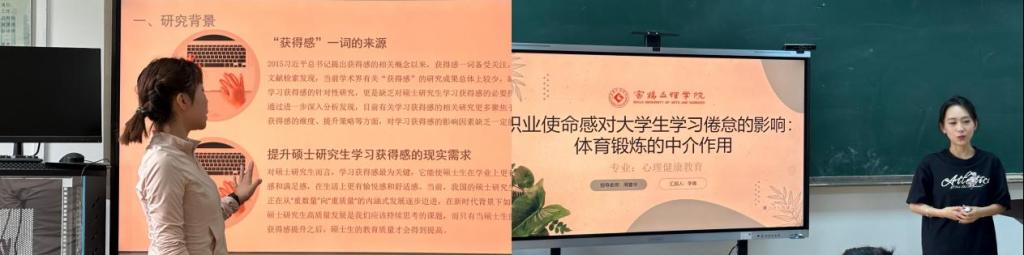 本次论坛由心理健康教育、学前教育的两位研究生进行汇报。2023级心理健康教育研究生李倩以《老员工职业使命感对学习倦怠的影响:体育锻炼的中介作用》为题,从研究背景和意义、研究方法和思路、研究工具和结果、参考文献四个方面进行汇报。2023级学前教育研究生郭兴怡以《基于扎根理论的硕士研究生学习获得感影响机制研究》为题,从研究背景、研究方法、研究思路、研究结果、提升路径五个方面进行汇报,并出自己的观点与看法。