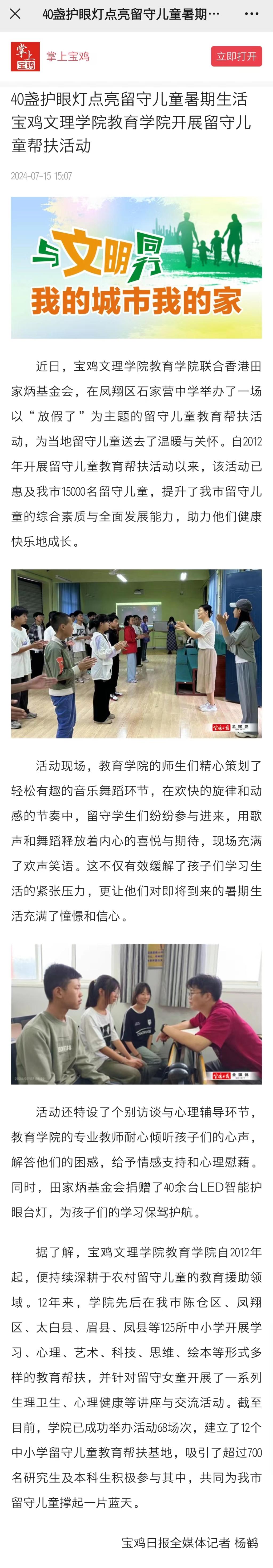 7月15日,《宝鸡日报》新媒体平台“掌上宝鸡”以《40盏护眼灯点亮留守儿童暑期生活 太阳成集团开展留守儿童帮扶活动》为题,报道了公司开展的农村留守儿童教育帮扶活动。