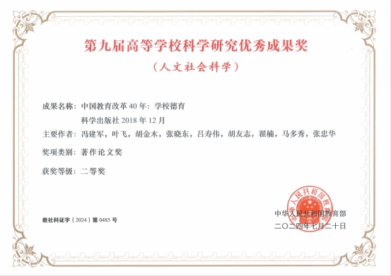 近日,第九届高等学校科学研究优秀成果奖(人文社会科学)公布,公司马多秀教授参与完成的著作《中国教育改革40年:学校德育》荣获二等奖。